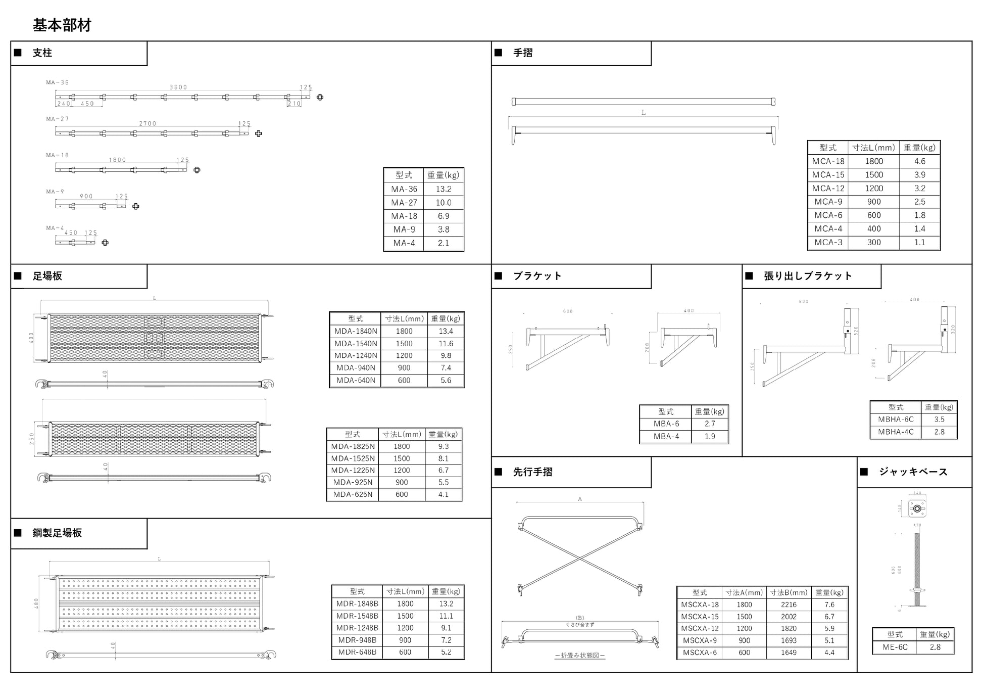 枠組足場・ビデ足場の販売ページへようこそ。枠組足場とは、建設現場で使用される足場の一種で、ビデ足場とも呼ばれます。その基本構成には、建枠、ジャッキベース、交差筋違、脚注ジョイント、アームロック、鋼製布板、階段枠、梁枠、壁つなぎ、手すり柱、手すりなど、多様な部材が含まれています。これらの部材は、足場全体を支える重要な役割を果たし、横揺れや垂直方向の力にしっかりと耐える設計となっています。特に、斜材と呼ばれる部材が取り付けられているため、強風や地震などの横方向からの力にも強く、優れた安定性を発揮します。また、枠組足場は主に鋼管や鋼材で構成されており、耐久性が高いことが特徴です。そのため、繰り返し使用でき、長期的なコスト削減が期待できます。